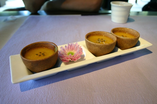 上第一道菜囉--現打芒果汁加百香果..香濃酸甜..