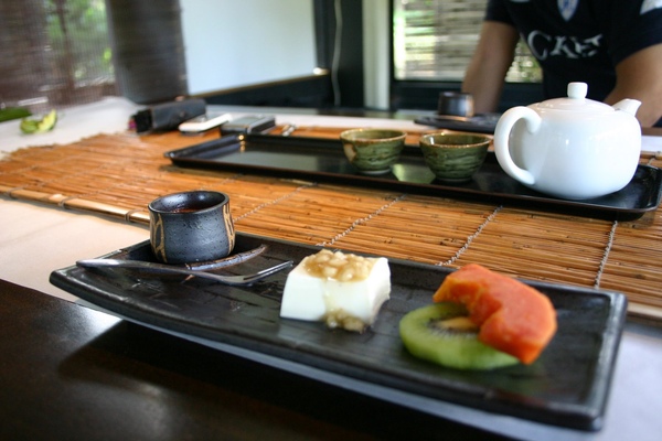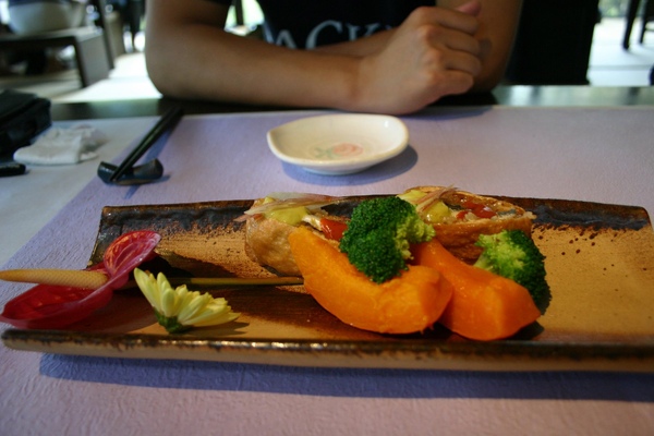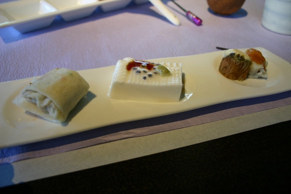 第二道菜..左邊-春捲.中間-花生手工豆腐.右邊-煄鮭魚.我最愛中間的那道.加哇沙咪味道好讚.口感一極棒