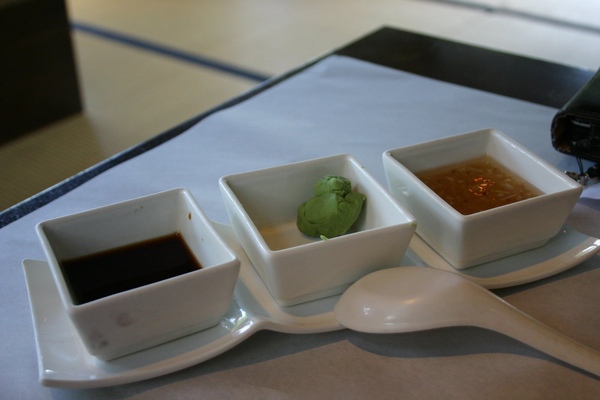 生魚片的醬汁..右邊沾蔬菜.中間是好吃的哇沙米..左邊是醬油