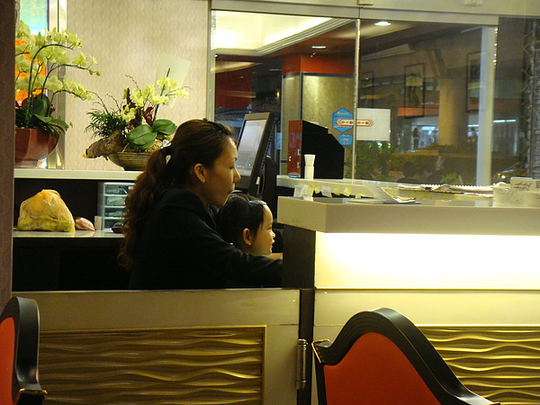 吃到最後..MII已經跟店員都成了好朋友..還跑進人家的櫃枱玩..阿姨還幫他綁漂亮的辮子呢..