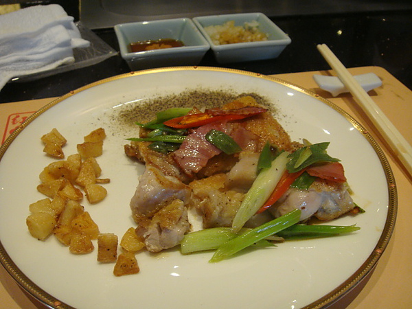 我的主菜:培根雞腿..知道為什麼我說廚師不用心了吧..不過視覺上亂歸亂..吃起來還是好吃啦..那個蒜頭比上次去101吃的那次好多了..沒有苦味呢..而且沒有蒜頭的辛辣味..不知是怎麼處理的..