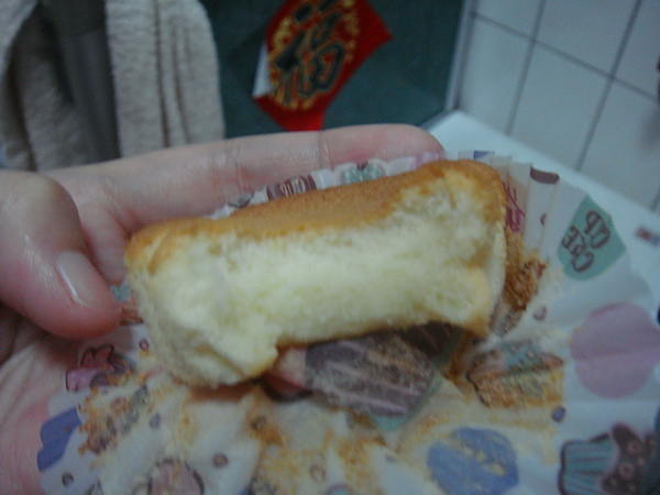雖然長的不好看.但.咬了一口..味道還不賴也..有種海綿蛋糕的感覺..外面酥酥.裡面香香軟軟的..好吃喲...