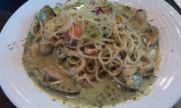 青醬海鮮義大利面..海鮮真是沒話說..新鮮..而且量又大..MII最近很愛吃花枝.剛好有很多..他一個人把這盤面就給他吃光了..媽媽我只有嚐到幾口而已..